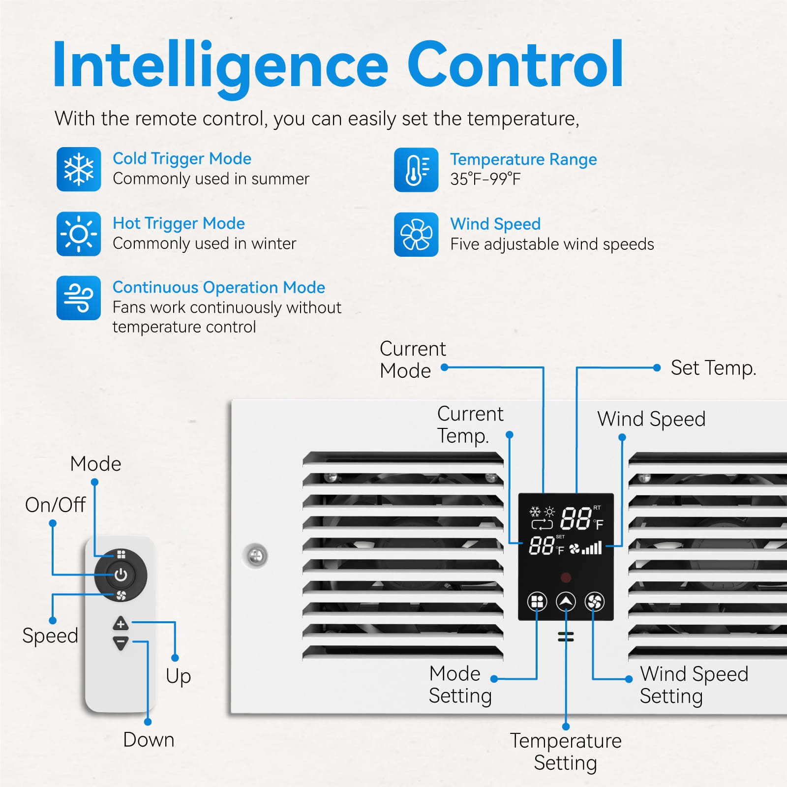 In Cooling Trigger Mode, the fan turns on when the room temperature is lower than your set temperature, This means the fan pulls the cool air to another room. To reduce another room temperature.